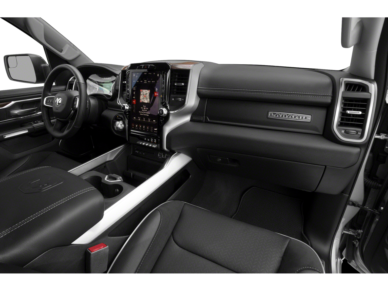#1 Seat Foam Cushion, 1-Yr SiriusXM Guardian Trial, 10 Speakers, 12 Touchscreen Display, 3 Rear Seat Head Restraints, 4 Way Front Headrests, 4-Wheel Disc Brakes, 48V Belt Starter Generator, 4G LTE Wi-Fi Hot Spot, 5-Year SiriusXM Traffic Service, 5-Year SiriusXM Travel Link Service, 8.4 Touchscreen Display, ABS brakes, Adjustable pedals, Air Conditioning, Alloy wheels, AM/FM radio: SiriusXM, Apple CarPlay, Apple CarPlay/Android Auto, Audio memory, Auto High Beam Headlamp Control, Auto-dimming door mirrors, Auto-dimming Rear-View mirror, Automatic temperature control, Brake assist, Bumpers: chrome, Chrome Exterior Mirrors, Compass, Delay-off headlights, Disassociated Touchscreen Display, Driver door bin, Driver Seat Memory, Driver vanity mirror, Dual front impact airbags, Dual front side impact airbags, Electronic Stability Control, Foam Bottle Insert (Door Trim Panel), For Details, Visit DriveUconnect.com, For More Info, Call 800-643-2112, Front anti-roll bar, Front Center Armrest w/Storage, Front dual zone A/C, Front fog lights, Front reading lights, Front Seat Back Map Pockets, Front wheel independent suspension, Fully automatic headlights, Garage door transmitter, Google Android Auto, GPS Antenna Input, GPS Navigation, HD Radio, Heated door mirrors, Heated Front Seats, Heated front seats, Heated Second Row Seats, Heated Steering Wheel, Heated steering wheel, Illuminated entry, Integrated Center Stack Radio, Integrated Voice Command w/Bluetooth®, Laramie Level B Equipment Group, Leather steering wheel, Leather Trim 40/20/40 Bench Seat, Low tire pressure warning, Memory seat, MOPAR Front & Rear Rubber Floor Mats, Occupant sensing airbag, Outside temperature display, Overhead airbag, Overhead console, Panic alarm, ParkSense Front/Rear Park Assist w/Stop, ParkView Rear Back-Up Camera, Passenger door bin, Passenger vanity mirror, Pedal memory, Power 4-Way Driver Lumbar Adjust, Power 4-Way Passenger Lumbar Adjust, Power 8-Way Driver & Passenger Seats, Power door mirrors, Power driver seat, Power passenger seat, Power steering, Power windows, Quick Order Package 27H Laramie, Radio data system, Radio: Uconnect 12 w/Navigation, Radio: Uconnect 4 w/8.4 Display, Radio: Uconnect 4C Nav w/8.4 Display, Rain Sensitive Windshield Wipers, Rear 60/40 Folding Split Recline Seat, Rear anti-roll bar, Rear seat center armrest, Rear step bumper, Rear Underseat Compartment Storage, Rear Wheelhouse Liners, Rear window defroster, Remote keyless entry, Remote Tailgate Release, Security system, SiriusXM Radio Service, SiriusXM Satellite Radio, SiriusXM Traffic Plus, SiriusXM Travel Link, SiriusXM w/360L, Speed control, Split folding rear seat, Steering wheel mounted audio controls, Tachometer, Tailgate Ajar Warning Lamp, Telescoping steering wheel, Tilt steering wheel, Traction control, Trailer Brake Control, Trip computer, Turn signal indicator mirrors, USB Host Flip, Variably intermittent wipers, Ventilated Front Seats, Ventilated front seats, Voltmeter, Wheels: 18 x 8 Aluminum Base Painted.